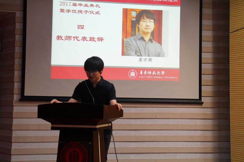 教师代表姜宇辉老师从智慧与大学的关系出发,阐述了自己对于教学活动的感悟。他认为,审慎、反省、质疑、批判,这些哲学气质已融入每一位华师哲学人的血液之中,以后也会深刻地影响到各位毕业生的人生,他希望大家可以一直践行这种哲学的生活方式,从而真正改变未来,改变世界。