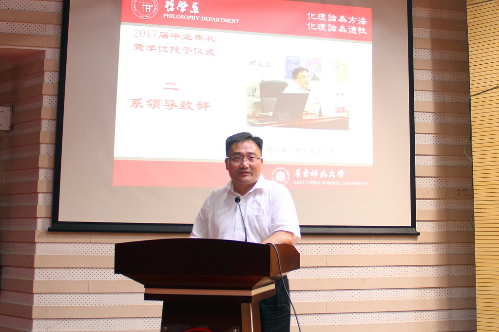 在庄严而肃穆的国歌声中,本次典礼正式拉开序幕。第一项,由系主任陈立新老师致辞。陈老师首先祝贺2017届毕业生们顺利完成学业,同时也提醒大家轻松的生活即将结束,未来的人生道路将充满各种挑战,无论如何,大家都要学会以一颗平常心、进取心、敬畏心、感恩心来面对生活。陈老师强调,作为一名哲学系的学生,应当拥有一颗 “大心脏”,树立以“天下为己任”的大局观,只有这样才能不断丰富自我,充实自我。最后,陈老师还深情地叮嘱各位毕业生常回家看看,这里永远是大家最温暖的港湾。